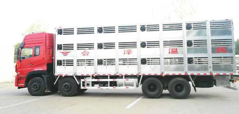 【豬苗車】上裝配置:外玻璃鋼,內(nèi)不銹鋼,兩層液壓升降層板,尾部液壓翻轉(zhuǎn)上豬平臺,層板為不銹鋼骨架鋪鋁花紋板。外部電動(dòng)升降窗,排氣扇,柴油發(fā)電機(jī),暖風(fēng)加熱,喂水系統(tǒng),凈水箱、污水