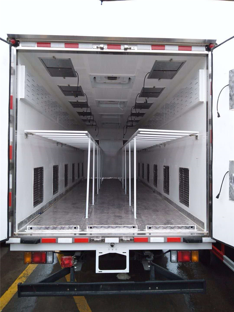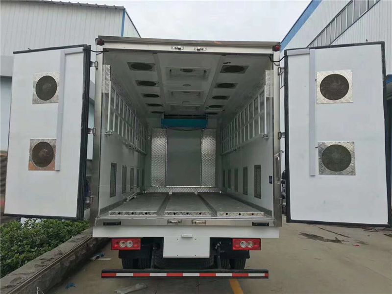 【豬苗車】上裝配置:外玻璃鋼,內(nèi)不銹鋼,兩層液壓升降層板,尾部液壓翻轉(zhuǎn)上豬平臺,層板為不銹鋼骨架鋪鋁花紋板。外部電動升降窗,排氣扇,柴油發(fā)電機,暖風(fēng)加熱,喂水系統(tǒng),凈水箱、污水箱,箱內(nèi)攝像頭監(jiān)控,倒車影像,凱利制冷機組。(油暖加熱為選裝部件)