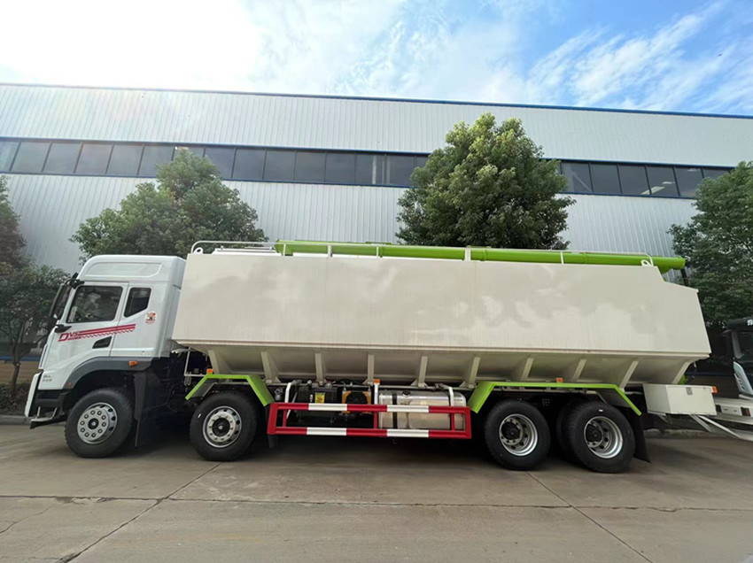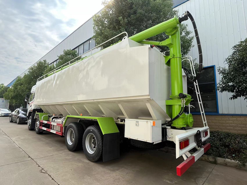 散裝飼料運(yùn)輸車,散裝飼料車的飼料罐架設(shè)在卡車的底盤上,罐頂開有進(jìn)料口.頂部的一根螺旋輸送卸料管(俗稱卸料絞龍)則可自由回轉(zhuǎn)和抬升,抬升的仰角可達(dá)60度。運(yùn)輸時(shí),頂部的螺旋管平臥在罐頂;卸料時(shí)則抬起,使管端的出料口與畜禽飼養(yǎng)場貯料罐頂部的進(jìn)料門相接,駕駛室內(nèi)裝有操縱裝置(操縱裝置也可裝置在罐體尾部),卸料時(shí)通過車底的動(dòng)力輸出軸和減速器來驅(qū)動(dòng)螺旋,以完成卸料。
